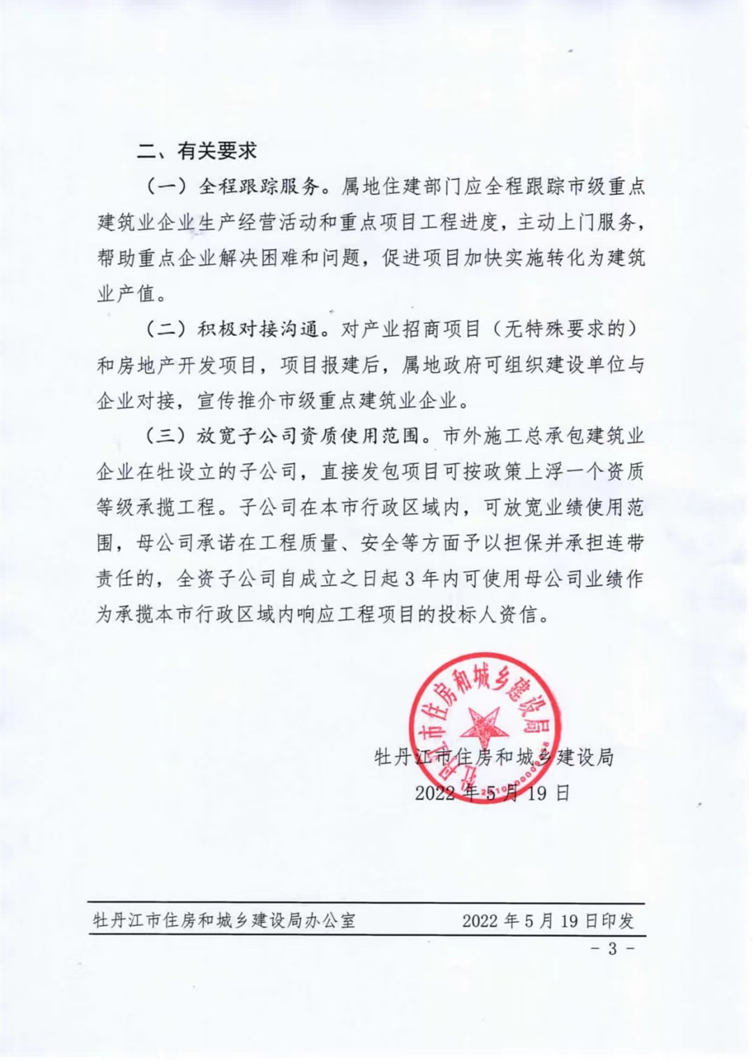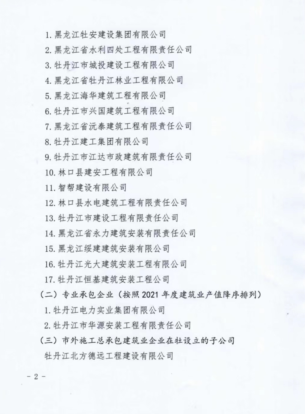 近日,牡丹江市住房和城鄉(xiāng)建設(shè)局下發(fā)文件牡建政發(fā)【2022】27號(hào)《關(guān)于印發(fā)牡丹江市重點(diǎn)建筑企業(yè)名單(第一批)的通知》,我公司霍然躋身全市施工總承包重點(diǎn)企業(yè)行列,名居前二甲。